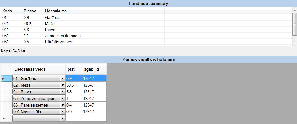 Augšējā sadaļā attēlots visa īpašuma zemesgabalu lietojuma sadalījuma kopsavilkums.