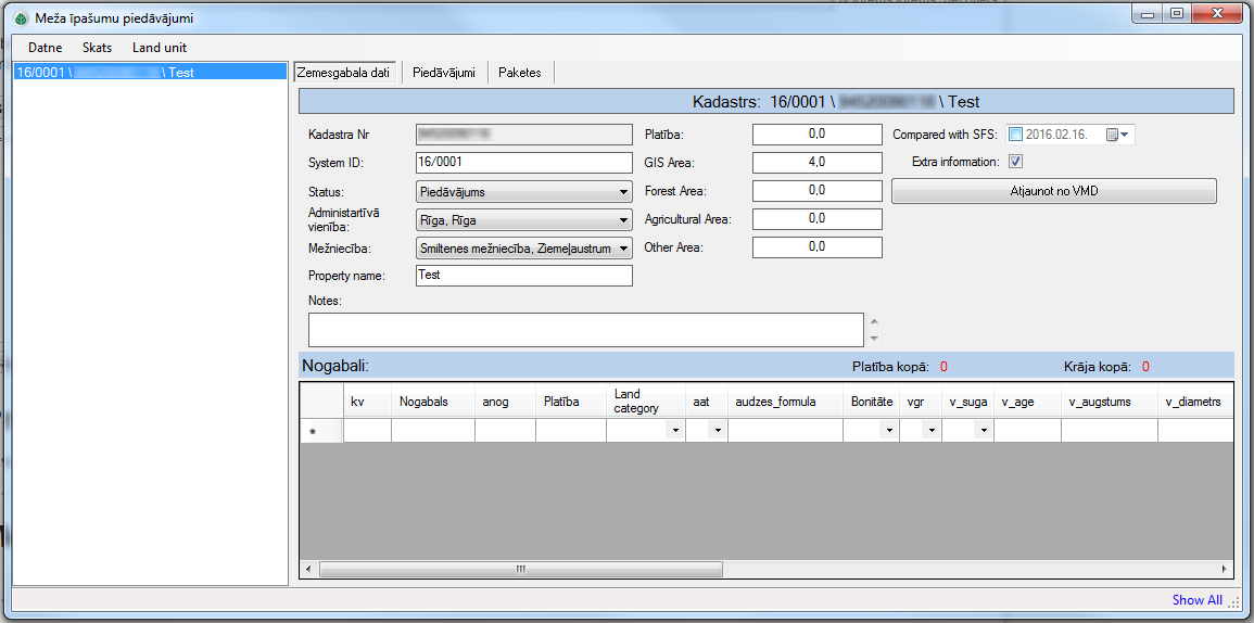 Ar pogu Atjaunot no VMD var iegūt jaunāko pieejamo kadastra ģeometriju un sadalījumu.