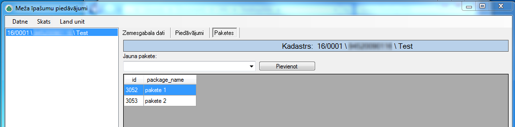 Pievienot jaunu paketi zemesgabalam var vai nu izvēloties lejupslīdošajā izvēlnē esošu paketi, vai turpat ierakstot nosaukumu jaunai paketei, tad nospiežot pogu Pievienot.