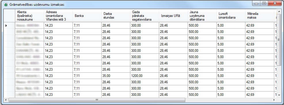Tabulā pieejams visu grāmatvedības darbību izcenojums katram uzņēmumam.