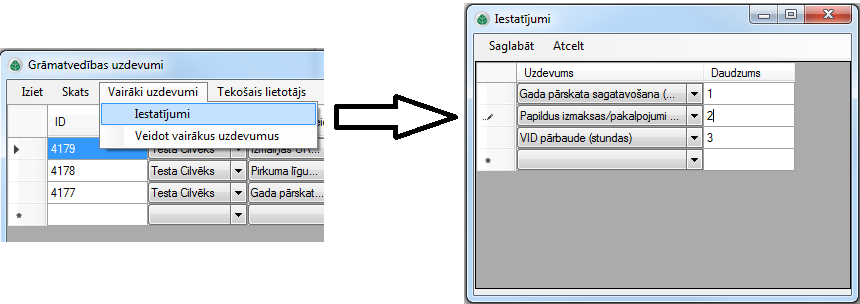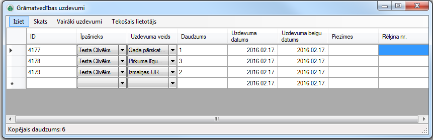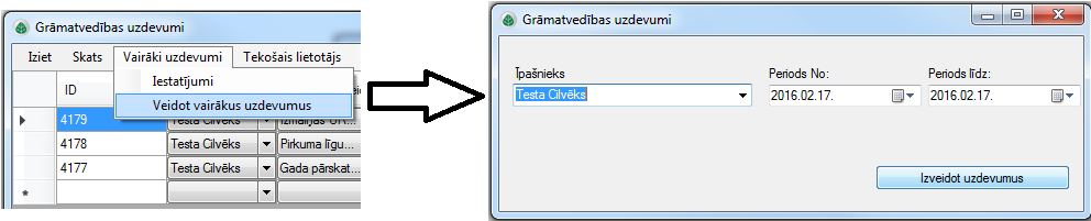 Tad izvēlnē Vairāki uzdevumi → Veidot vairākus uzdevumus jāizvēlas, kurai personai uzdevumi veikti un kad, tad jāpievieno.