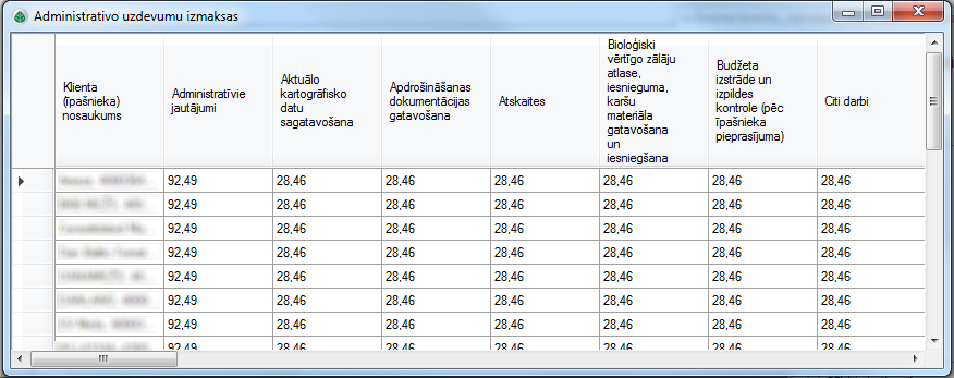 Tabulā pieejams visu administratīvo darbību izcenojums katram uzņēmumam.