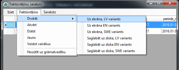 Tas iespējams izvēlnē FaktūrrēķinsDrukāt.