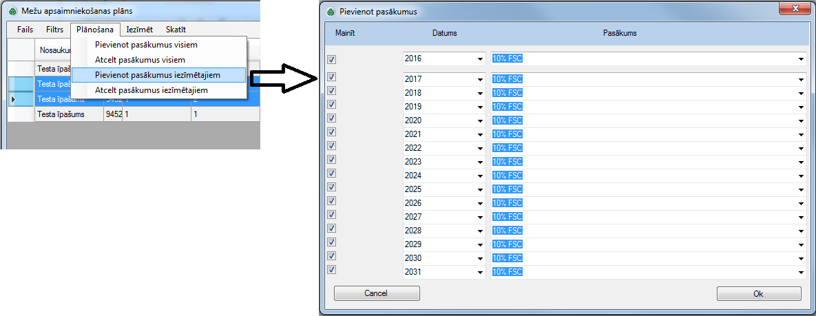 Atvērtajā logā var sekojošajiem gadiem izvēlēties ieplānoto apsaimniekošanas pasākumu. Tiks pievienoti tikai tie plānotie pasākumi, pie kuriem ir atzīmēta kreisajā malā esošā izvēles rūtiņa.