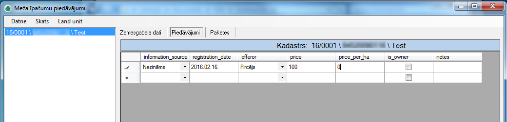 Zemesgabalam var pievienot jaunu piedāvājumu cilnē Piedāvājumi, tabulas pēdējajā, tukšajā rindiņā ievadot piedāvājuma informāciju.