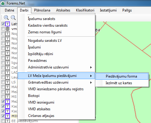 Otrs veids ir galvenās lapas izvēlnē DarbiLV Meža īpašumu piedāvājumiIezīmēt uz kartes, kas ļauj uz kartes uzzīmēt piedāvājamo teritoriju.
