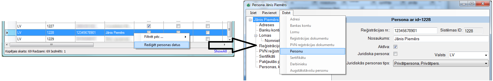 Tabulā jāatrod rediģējamā persona, ar labo peles pogu uz tās jāuzspiež un tad Rediģēt personas datus.