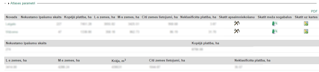 Atskaites apakšējās tabulas ir kopsavilkuma daļa, kur ir redzamas pamatdatu tabulas lauku summas un lauks „Krāja, m3“, kurš tiek iegūts no VMD sniegtajiem datiem. Lauks „Tai skaitā aizsargājamās teritorijas“ parāda to, cik liela kadastra vienību platība pārklājas ar kādu no valsts nozīmes aizsardzības teritoriju.